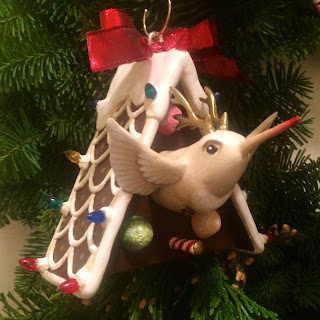 The idea behind my ornament was to have my hummingdeer character flying out of a gingerbread birdhouse. I started by creating an armature (which is basically the skeleton of a sculpture) with craved foam, wire and masking tape. I used light weight materials to cut down on the heaviness of the ornament so it would hang easily without putting too much weight on a christmas tree branch. The frame for the birdhouse is a prefabricated basic wooden craft ornament that I modified and sculpted on top of. I also used a string of mini craft christmas lights and ribbon to finish it off.
