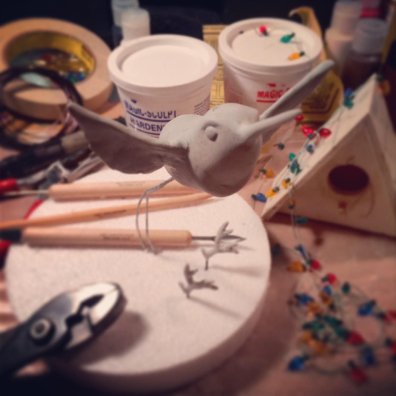 I decided to sculpt and paint the hummingdeer and gingerbread birdhouse separately to make it easier to work on small details and paint areas that would otherwise be hard to reach had they been attached. I made sure to leave grooves in the birdhouse where the hummingdeer's wings would rest so that there would be multiple spots to attach and secure it. After finishing the sculpt, I primed the entire thing with a few thin coats of gesso.