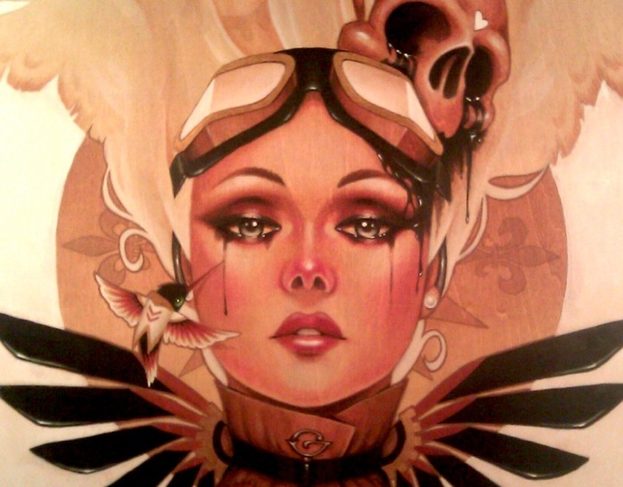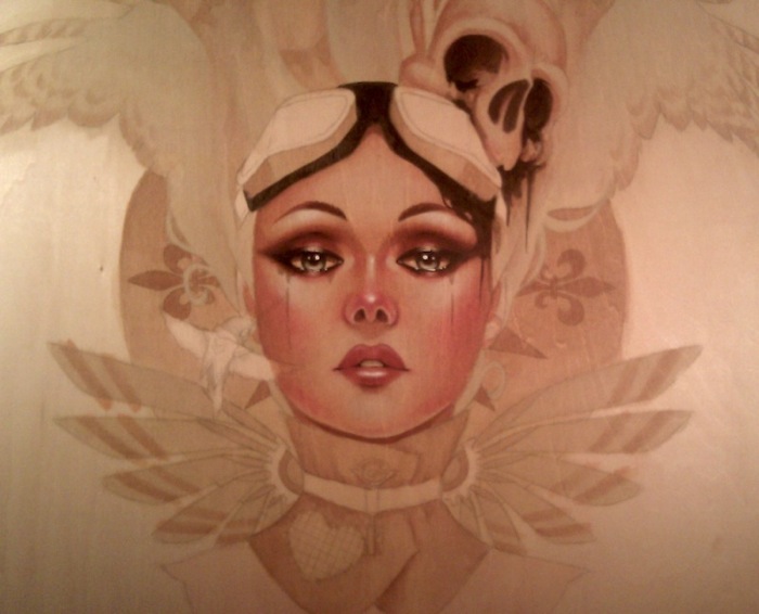 Once I got her drawn out on the wood panel I felt like there was something missing. I wanted her to have more elements of flight and surrealism so I added the wings to her hair and gave the hummingbird a little military type jacket.