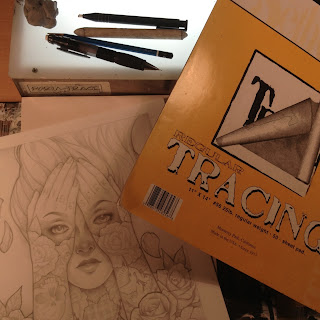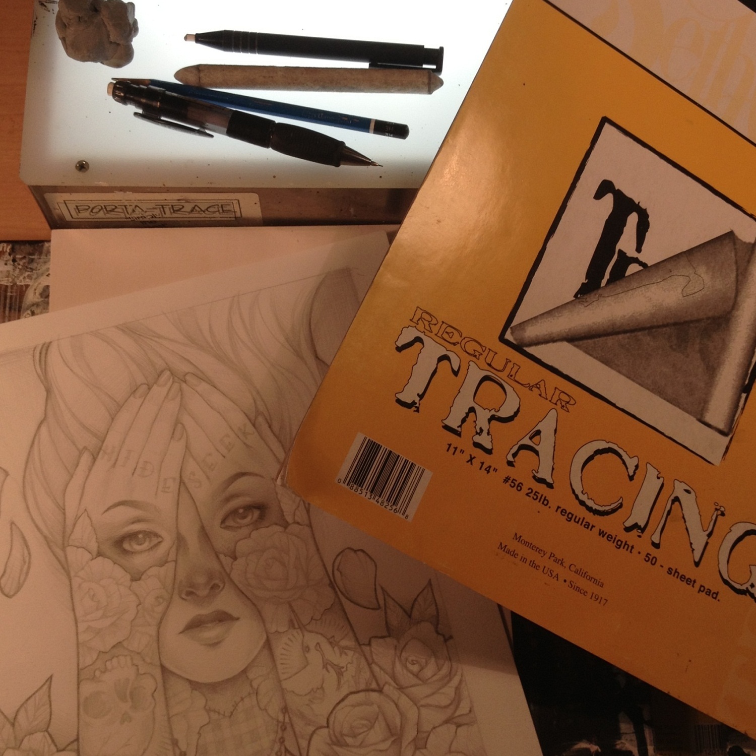 First I make sure that I have all the tools that I need to make a transfer sheet. To transfer this piece I'll be using the original sketch, a lightbox, tracing paper, a soft lead mechanical pencil, a hard lead drawing pencil, a blending stump and the prepped wood panel that I will be transferring the sketch to.