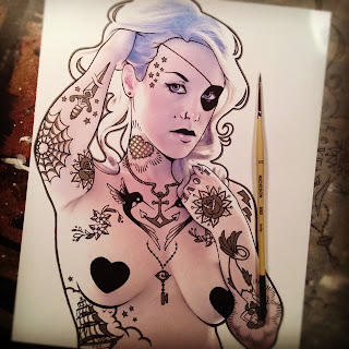 I used acrylic paint mixed with a small amount of acrylic ink to help the paint glide a little easier over the photograph. Ink alone did not give enough solid coverage and smeared too easy on the photo paper so the paint was a definite necessity! I also had to use a very tiny brush as the photo was only an 8x10 so some of the tattoo designs ended up being super little!